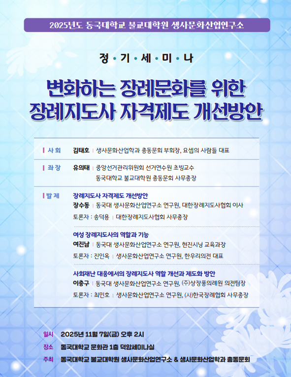 이번 세미나는 동국대 생사문화산업연구소와 생사문화산업학과 동문회가 공동 주관하며, 11월 7일 동국대 문화관 덕암세미나실에서 열린다. 주제는 ‘변화하는 장례문화를 위한 장례지도사 자격제도 개선방안’으로, 장례문화 전문가와 현장 실무자들이 함께 모여 ▲장례지도사 자격체계의 현실적 과제 ▲여성 장례지도사의 역할 강화 ▲사회재난 대응체계 내 장례전문 인력 제도화 등을 집중적으로 논의한다.