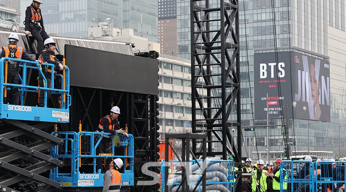 【STV 박란희 기자】그룹 방탄소년단(BTS)의 군 복무 후 첫 완전체 컴백 공연을 앞두고 무대 설치가 시작된 서울 광화문 광장 일대가 벌써부터 뜨거운 열기로 가득 찼다. 21일 오후 8시 개최될 이번 공연을 위해 15일 밤부터 무대 설치 작업이 본격화되었으며 안전 펜스 설치로 인해 광장 주변 보행로와 일부 차량 통행이 제한되고 있다.