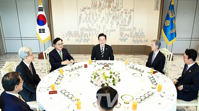 【STV 김형석 기자】이재명 대통령은 3일 비상계엄 사태 1년을 맞아 서울 용산 대통령실로 5부 요인을 초청해 오찬을 함께했다. 이 자리에는 우원식 국회의장, 김상환 헌법재판소장, 김민석 국무총리, 노태악 중앙선거관리위원장과 함께, 최근 여권과 갈등을 빚고 있는 조희대 대법원장도 참석해 눈길을 끌었다.