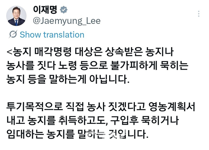 【STV 김형석 기자】이재명 대통령은 25일 농사를 하지 않는 농지에 대해 강제처분명령 집행을 지시한 것과 관련해 경자유전(耕者有田)의 원칙을 이해하지 못하고 매각명령을 하라는 제 지시를 두고 공산당 운운하는 분들이 있다고 밝혔다. 이 대통령은 이날 엑스(X·옛 트위터)에 글을 올려 자신의 발언에 대한 불필요한 이념 논란을 정면으로 반박했다.